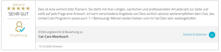 👉 Wenn es bei dir allerdings um ernsthafte Konflikte, Aggression oder Trennung der Katzen geht, ist mein Programm United Cats die bessere Wahl. Dort arbeiten wir gezielt an Zusammenführung, Harmonie und Konfliktlösung.