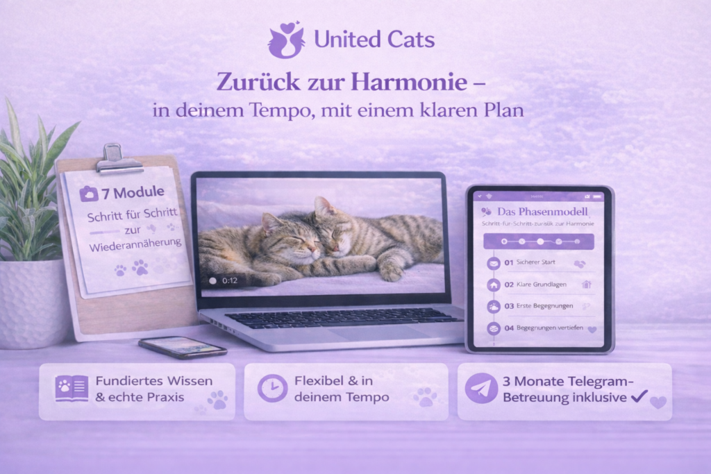 Oberflächliche Tipps und widersprüchliche Ratschläge? Fehlanzeige. Mit über 2 Jahren Erfahrung in der Arbeit mit Mehrkatzenhaushhalten kann ich überzeugt sagen: United Cats ist der klarste, strukturierteste Weg, den du gehen kannst, um deinen Katzen wirklich zu helfen.