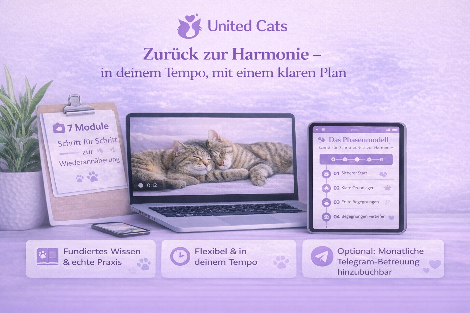 Der Selbstlernkurs zeigt dir einen klaren, erprobten Weg für die Wiederannäherung deiner Katzen.